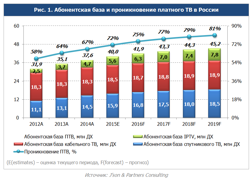 Российский рынок платного ТВ является крупнейшим в Европе: по итогам 2014 года он насчитывает 37,6 млн домохозяйств, подключенных к технологиям кабельного, спутникового и IP-телевидения. Д. Об этом говорят данные исследования компании J’son & Partners Consulting.